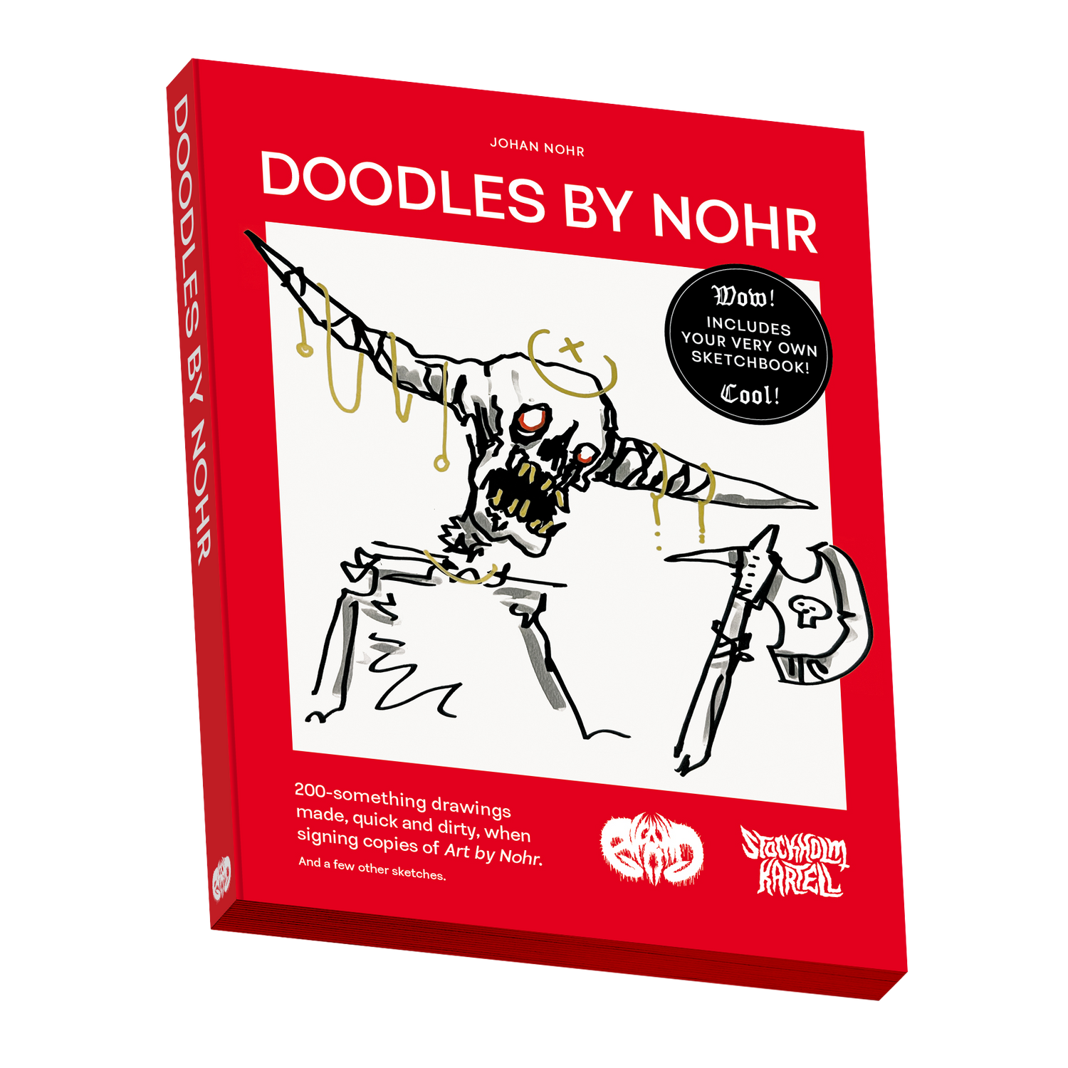 Finally, my next artbook is available for preorder at pit trap shop .com! Doodles by Nohr is a 264-page collection of scribbly skeletons, monsters and medieval corpses-to-be hastily drawn when signing my big-ass artbook Art by Nohr. Expected to deliver in early March.