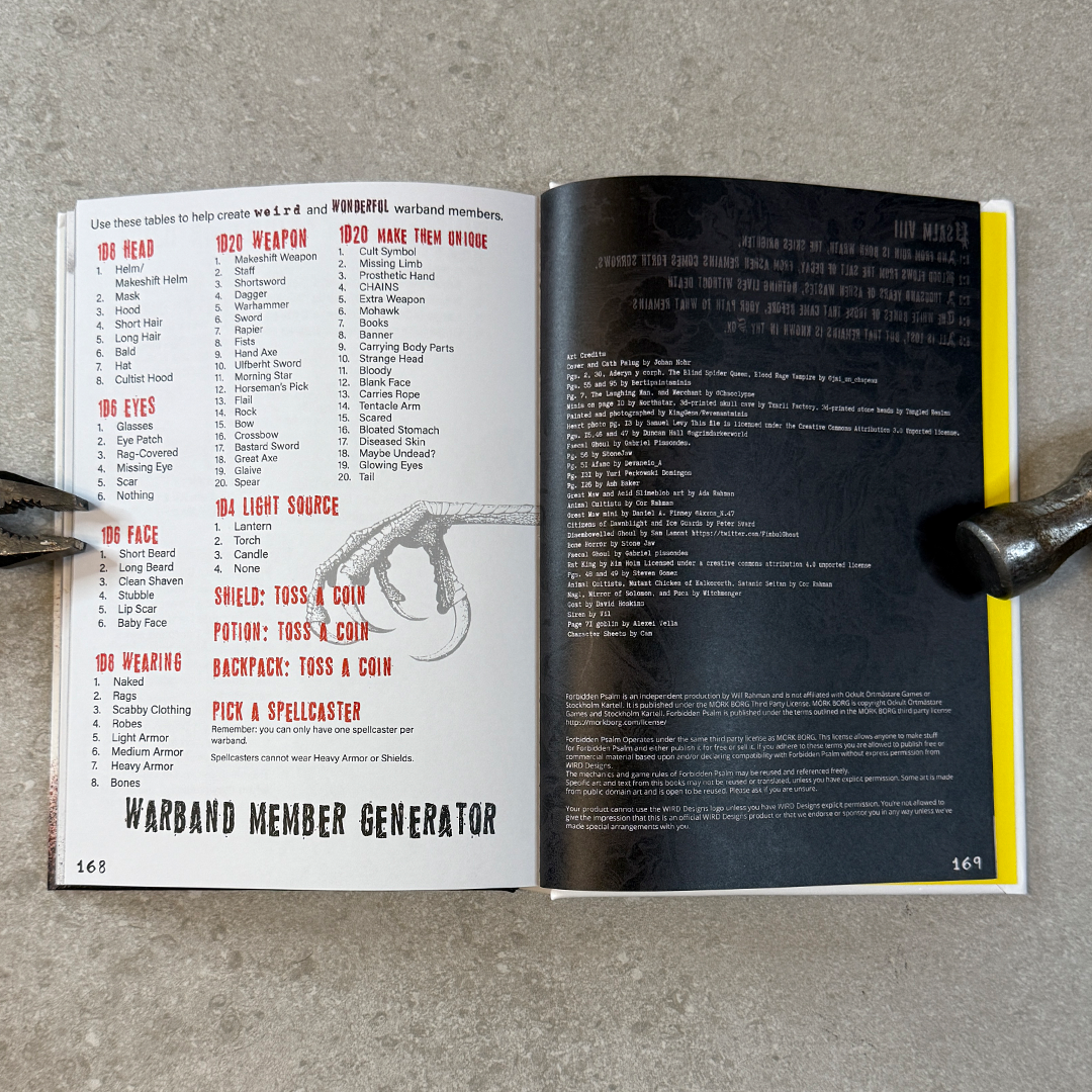 Forbidden Psalm is an independent production by Kevin Rahman and is not affiliated with Ockult Örtmästare Games or Stockholm Kartell. It is published under the MÖRK BORG Third Party License.