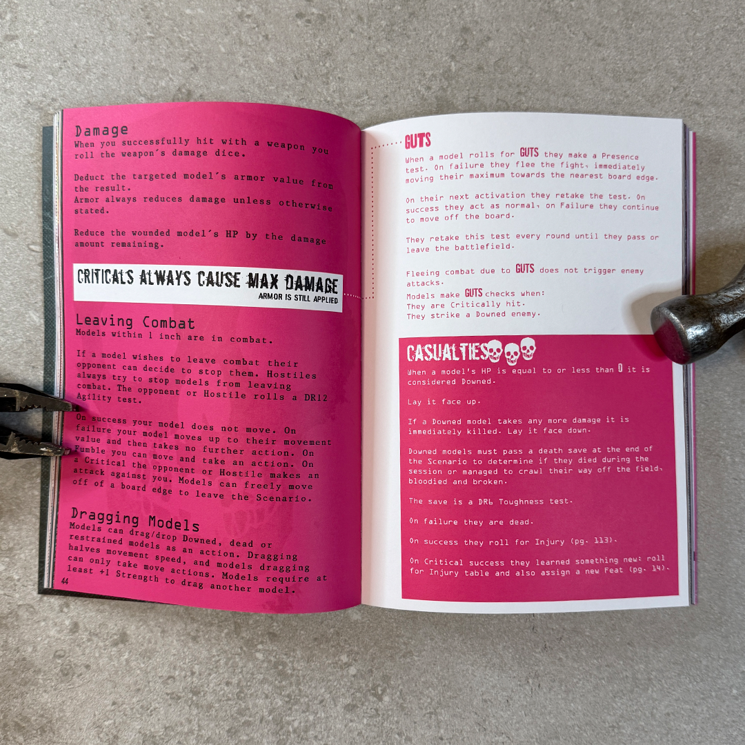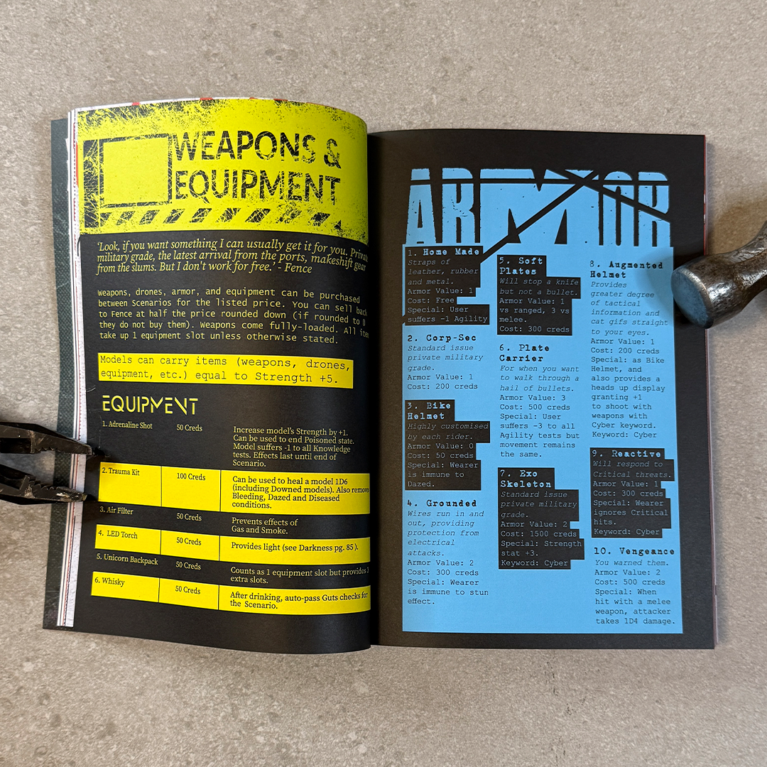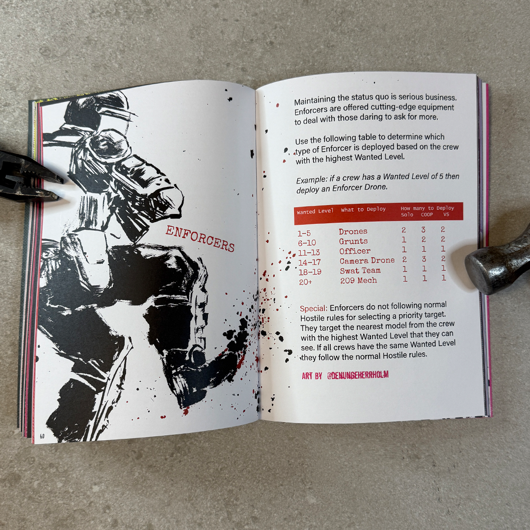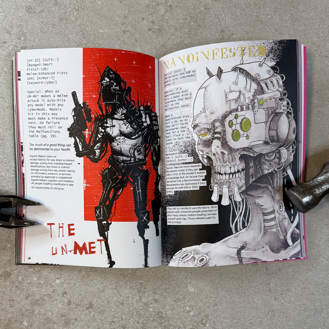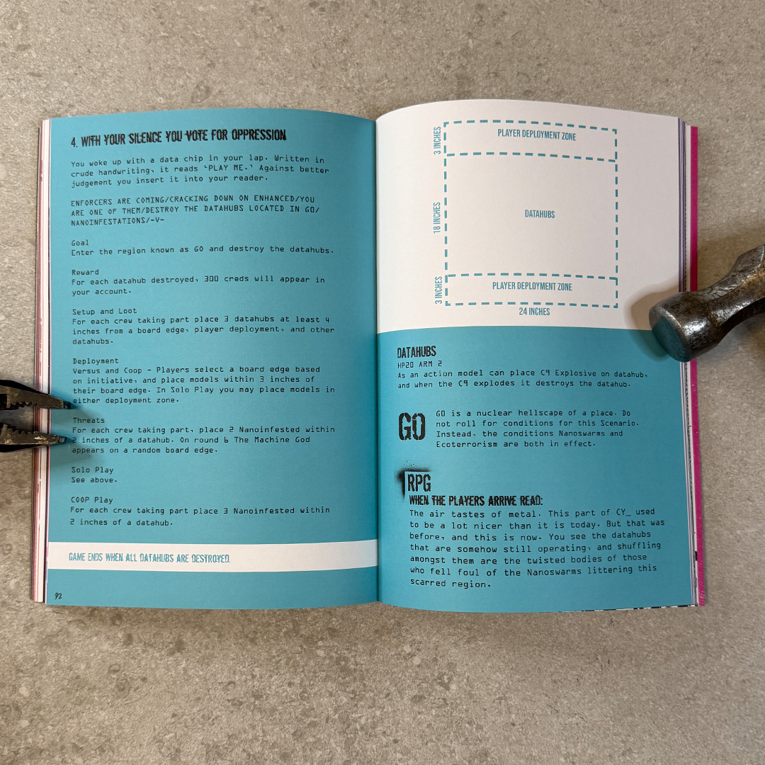 Kill Sample Process is a small-scale skirmish game, where you play with a crew of 5 miniatures per player, against AI controlled Hostiles in scenarios that take you across the neon hell scape of CY_. Play as enemies, cooperatively or solo.