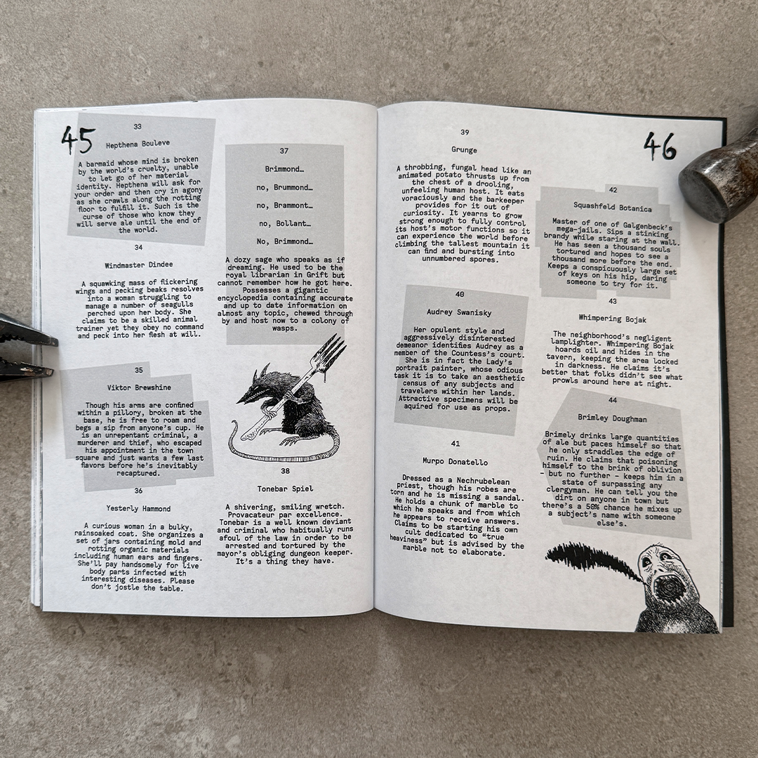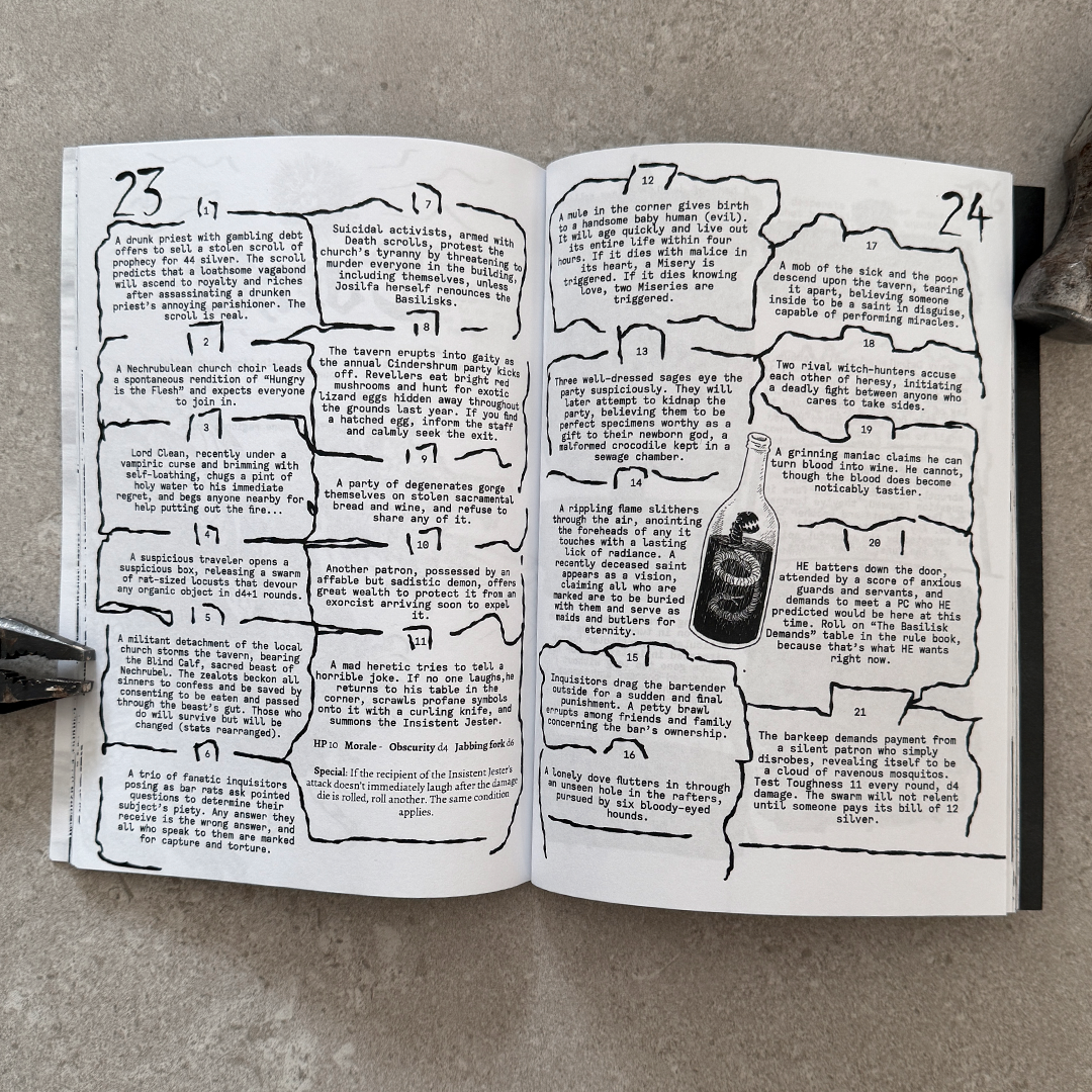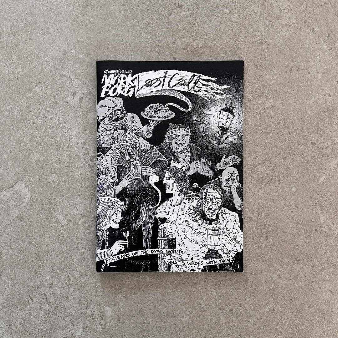 LAST CALL is a 60ish-page saddle-stitched zine overflowing with everything a MÖRK BORG game master needs to create a memorable and distinct tavern experience full of adventure hooks and improvised encounters. Use on the spot, or mine for inspiration to support an entire adventure.
