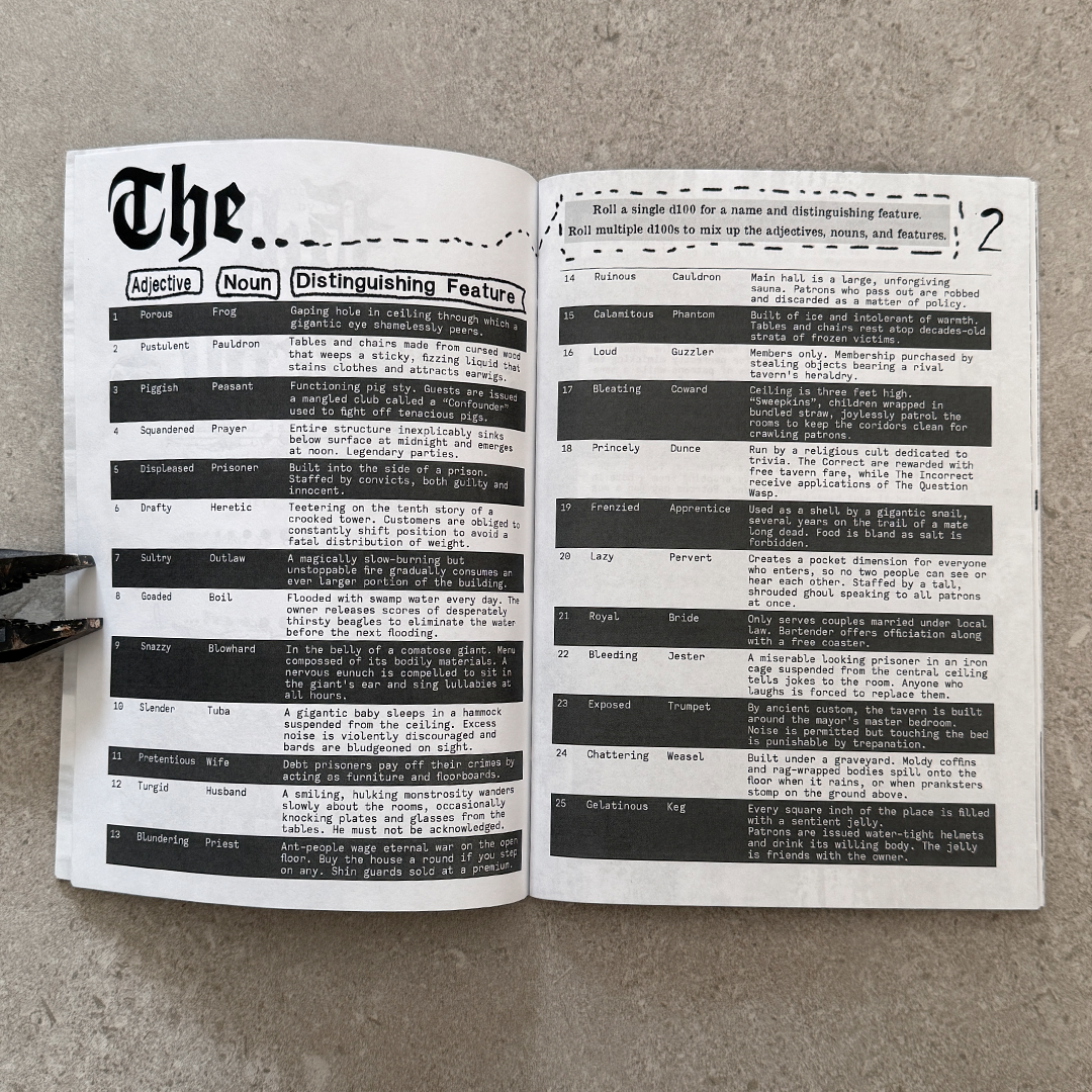 - A d100 x d100 table with a thousand possible tavern names, even more if you get a little fancy.