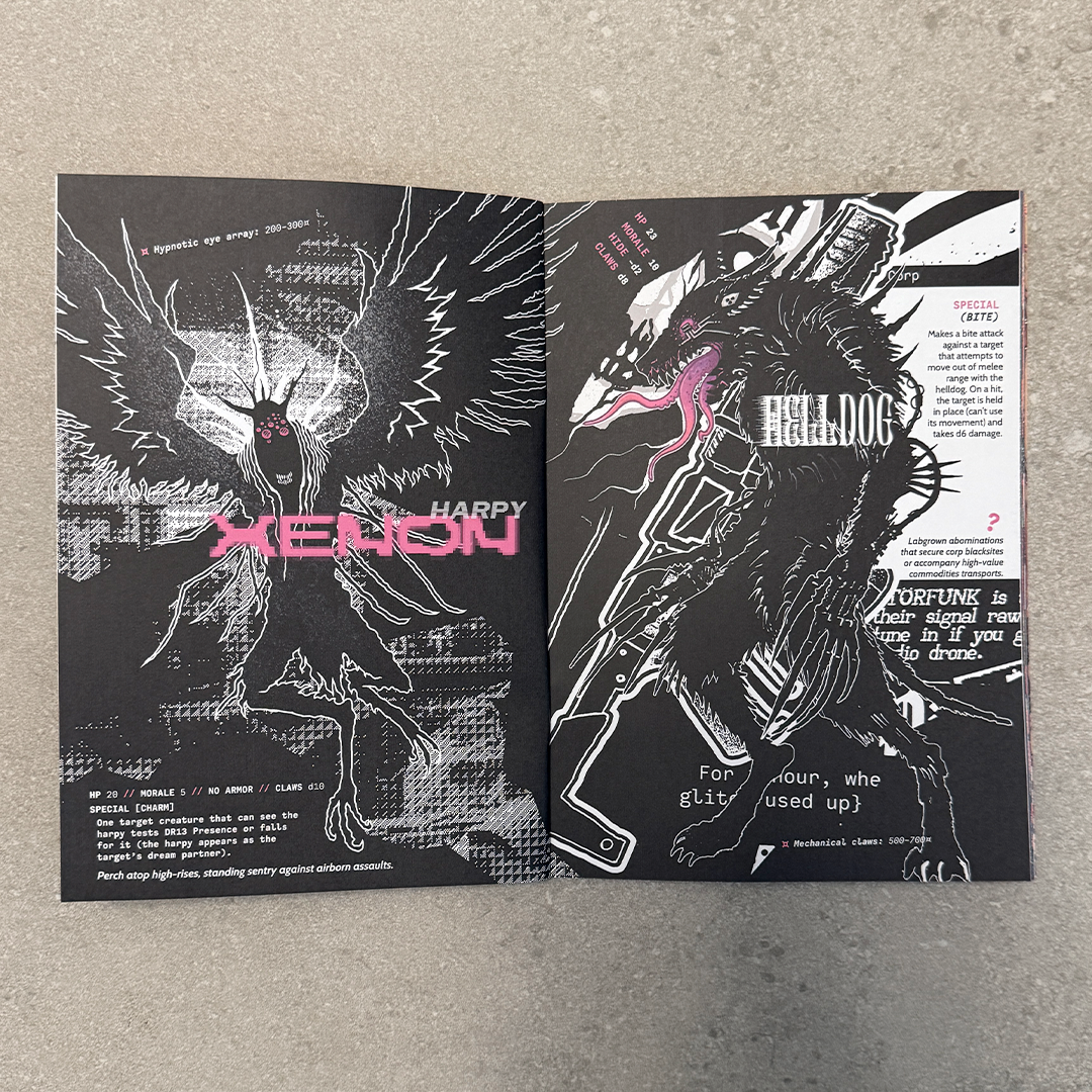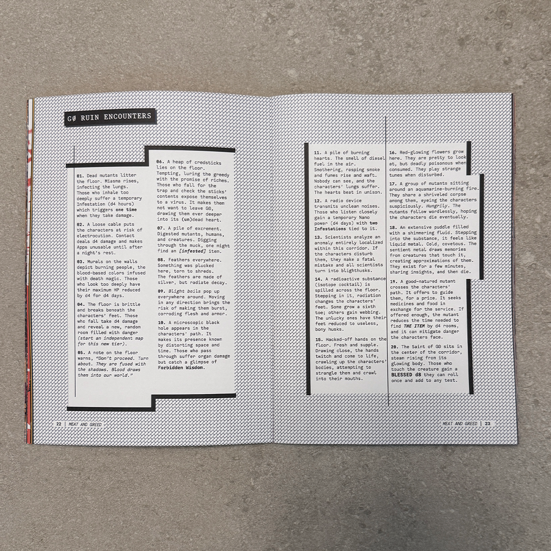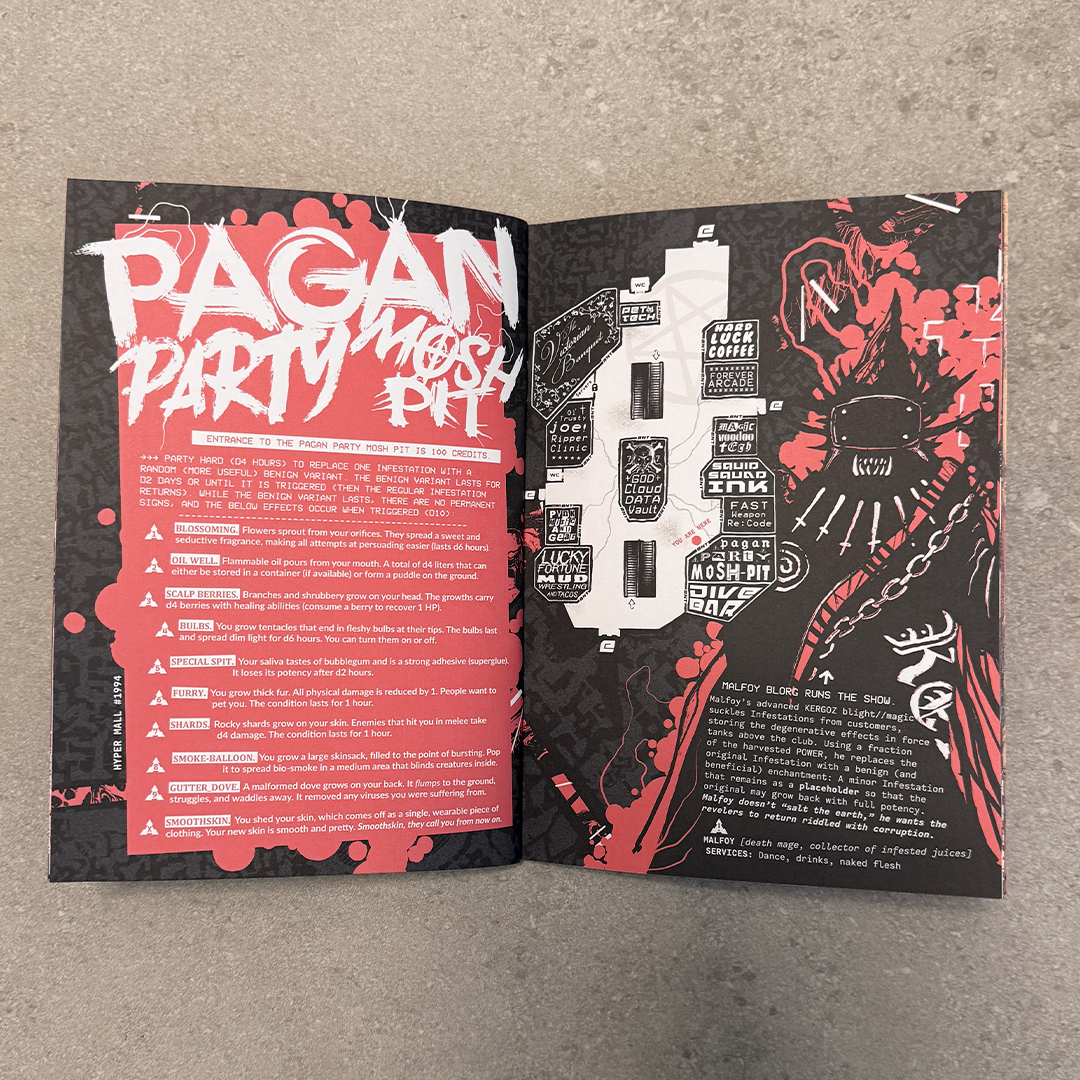 Meat&Greed is a CY_BORG supplement by Christian Eichhorn (christian.eichhorn.dmg@gmail.com; @christianeichhorn.itch.io [BLUESKY]), with editing by John Parker. The MEAT might be fake, but the GREED is real. Plunder G0, rescue the cows (and unleash hell), fumble, activate status effects, get mauled by a bunch of monsters, explore HYPER MALL #1994, and more!