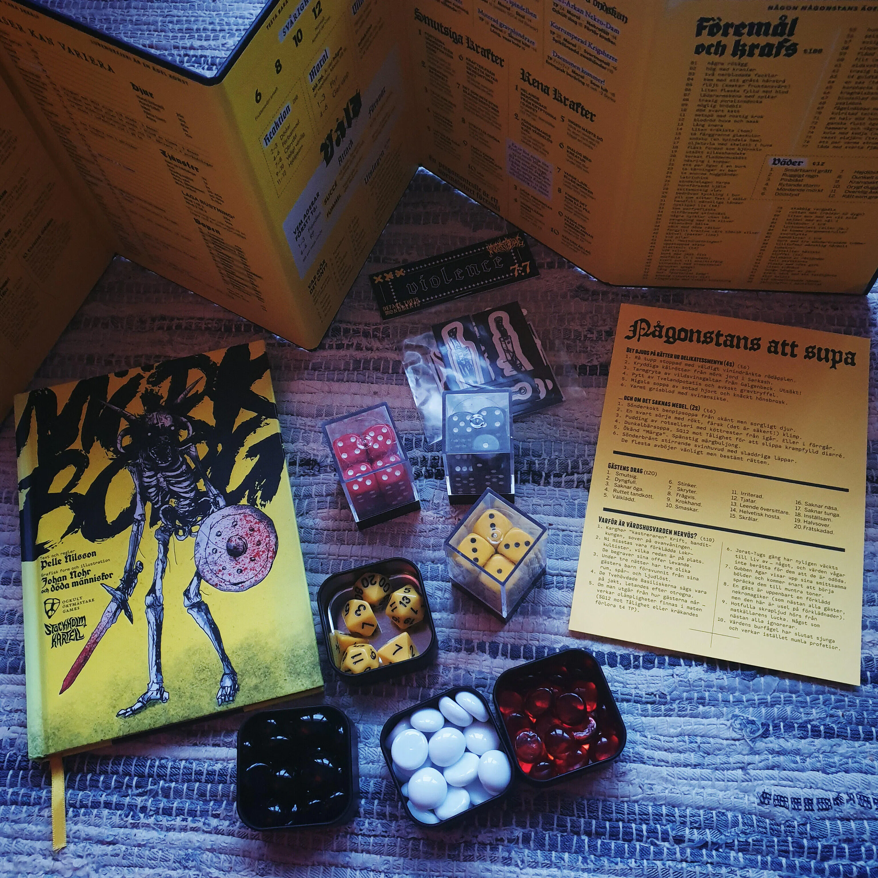 The MÖRK BORG GM Screen is a five-paneled portrait wall of death, printed with gold metallic ink on one side and vivid neon yellow on the other. The front is all art, five scenes of various locales and important characters in the Dying world. The GM-facing side sports a wide array of tables and rules summaries that might come in handy during play.
