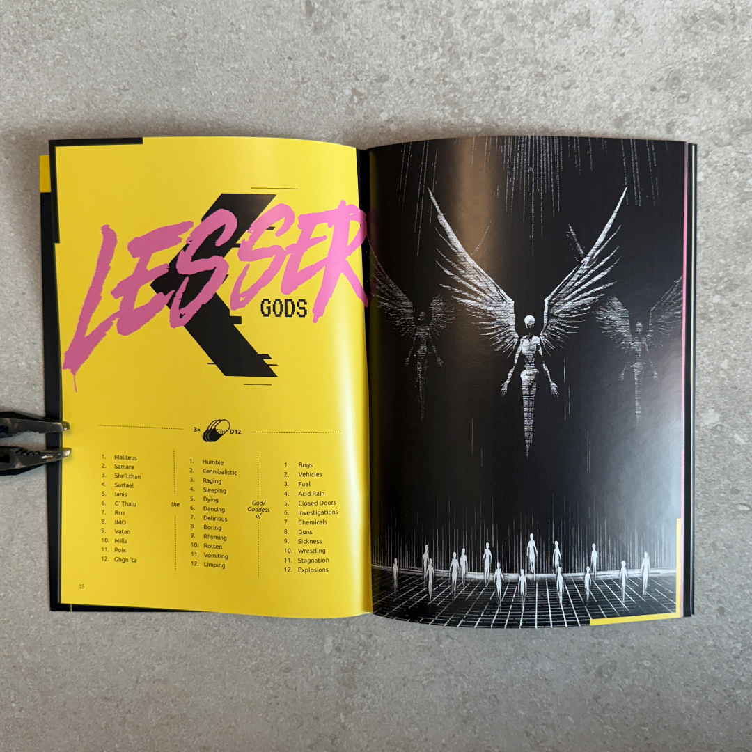 P!LLS FVLL of GODS is a 3rd part supplement for the cyberpunk horror game CY_BORG. Inside, on 56 pages, you’ll find: