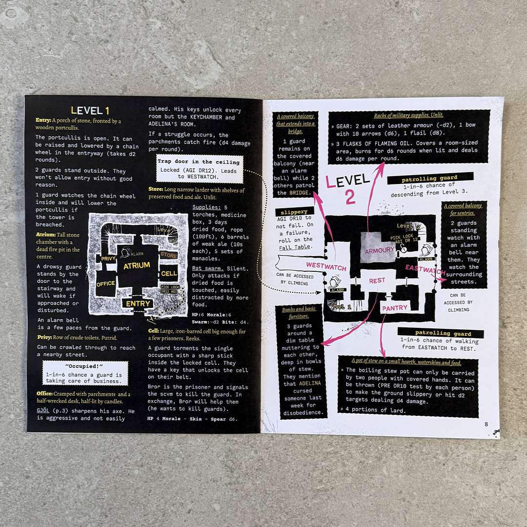 - A heist adventure with guidance on PC information gathering, a tower alert level system, and a rival party to stir things up.